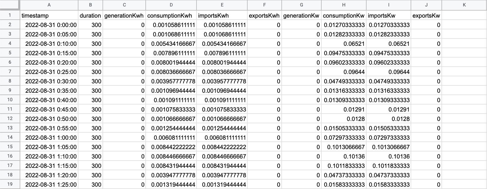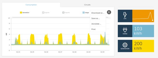 Hitting the Save as CSV while viewing the Consumption will provide you with summarise data, i.e., it provides the summary of energy generated, imported, and exported as shown in the snippet below: