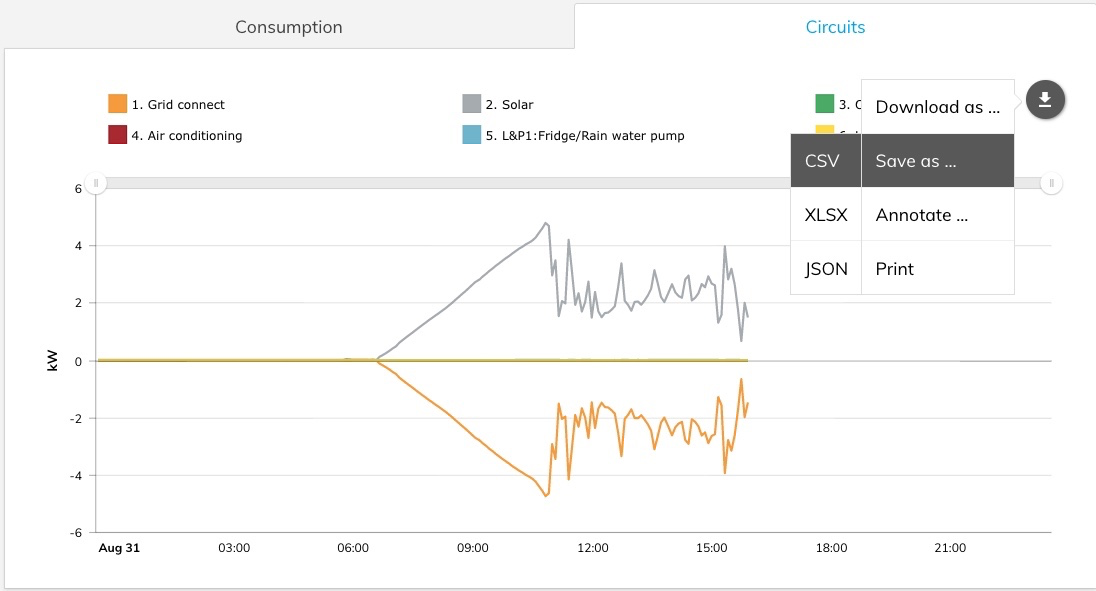 To download the energy data coming from each circuit, make sure to hit the Save as CSV button while viewing the Circuits tab as shown below: